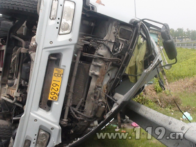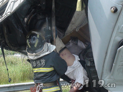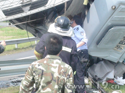 6月29日中午13时30分许,江苏省盐城市大丰消防大队接到市110的调度指令,位于沿海高速大丰出口处,一辆满载烟花的集装箱卡车发生侧翻,有人员被困。