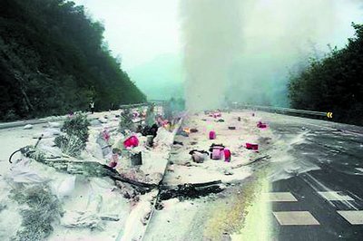 到达现场后,民警发现事故车是一辆中型货车,车辆横置于高速公路行车道,中央隔离带的树木起火燃烧,散落在路面的货物也不断冒出滚滚黑烟,造成该路段交通堵塞。民警经询问得知,该车运输的是制作鞭炮用的原材料,主要是硫磺粉、硝粉、珍珠岩粉之类的货物。