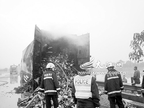 本报讯 韦正丁、记者黄建华摄影报道:10月15日凌晨3时40分许,一辆满装烟花爆竹的集装箱货车行驶至沪昆高速公路南昌往上饶方向718公桩处时突然起火,车上的烟花爆竹发生爆炸,两名驾驶员慌乱之中逃离了现场。