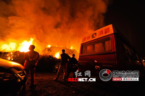 8日晚9点左右,记者赶到现场。在永和镇内即可看到远远一山头火光冲天,循着火光记者找到了事发点。此时爆炸点附近已被封闭,现场救援人员正在点燃路边的杂草,火势越烧越旺,瞬间整个山头都被大火覆盖,半边天空都被烧红了。