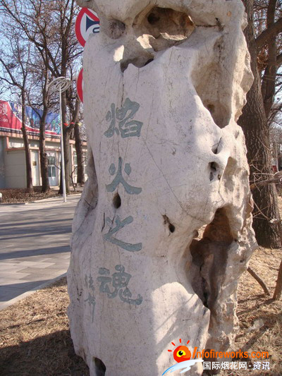 一进厂门,一块历经沧桑的太湖石立在眼前,上述四个大字:“焰火之魂”,04年参观工厂的时候我在石头前留过影。虽然北京礼花厂现在已经不存在了,但我感觉她的魂还在。