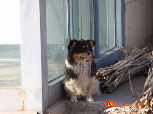 一只可爱的小狗坐在研究所的阶沿上,似乎在盼望主人的回来。